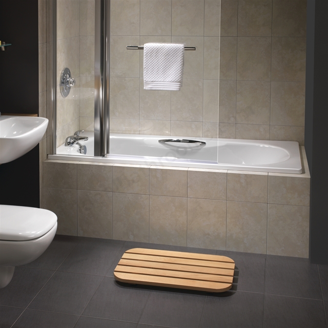 Crafted from enamelled steel, it features an anti-slip surface and integrated chrome handles, ensuring a secure and comfortable bathing experience for users of all ages.