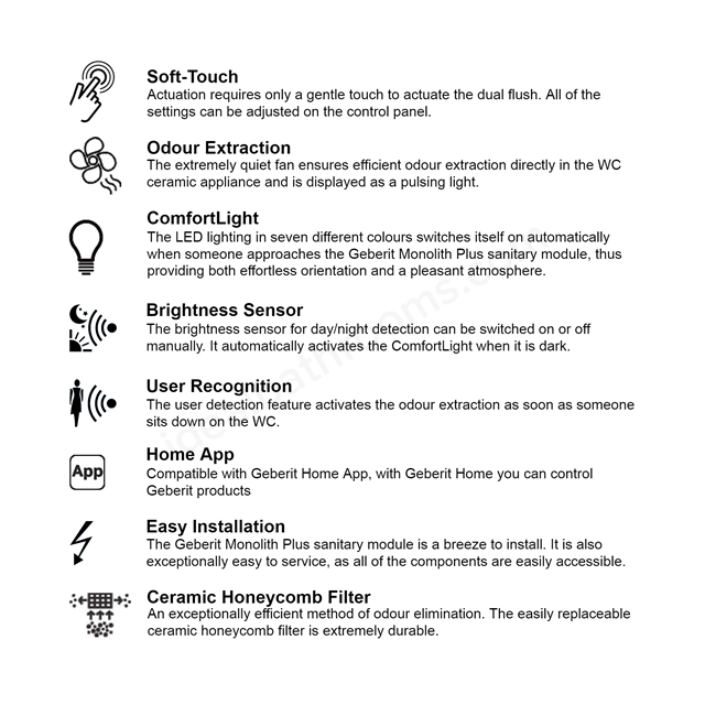 The integrated odour extraction is provided by a ceramic honeycomb filter; the easily replaceable ceramic honeycomb filter is extremely durable. The user detection feature activates the odour extraction as soon as someone sits down on the WC.