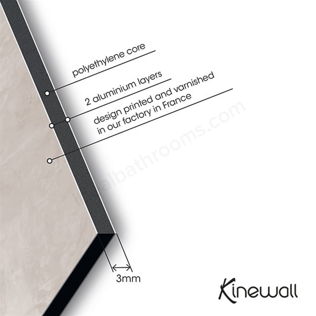 The Kinewall Design is the solution for a quick and easy bathroom renovation; but is also suitable for new construction. The wall panels can be placed on any coating; without any preparation work. Made of a resin and aluminum; these panels with a smooth surface are available in 2 widths; 1 height and upto 21 different designs; enough to give free rein to your desires and ideas.